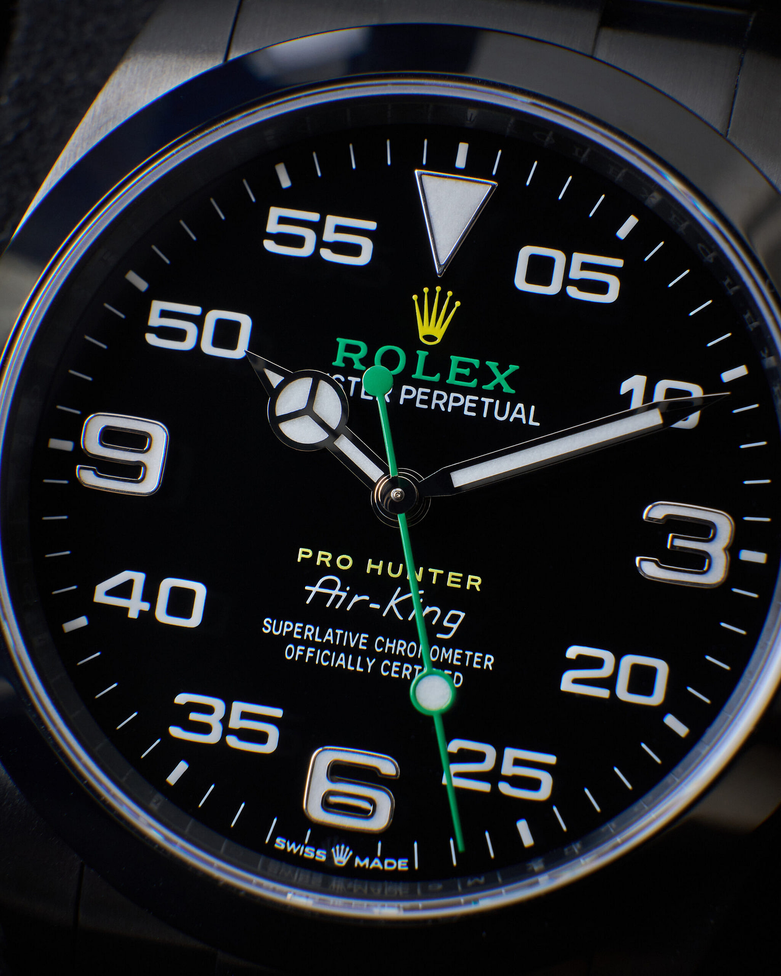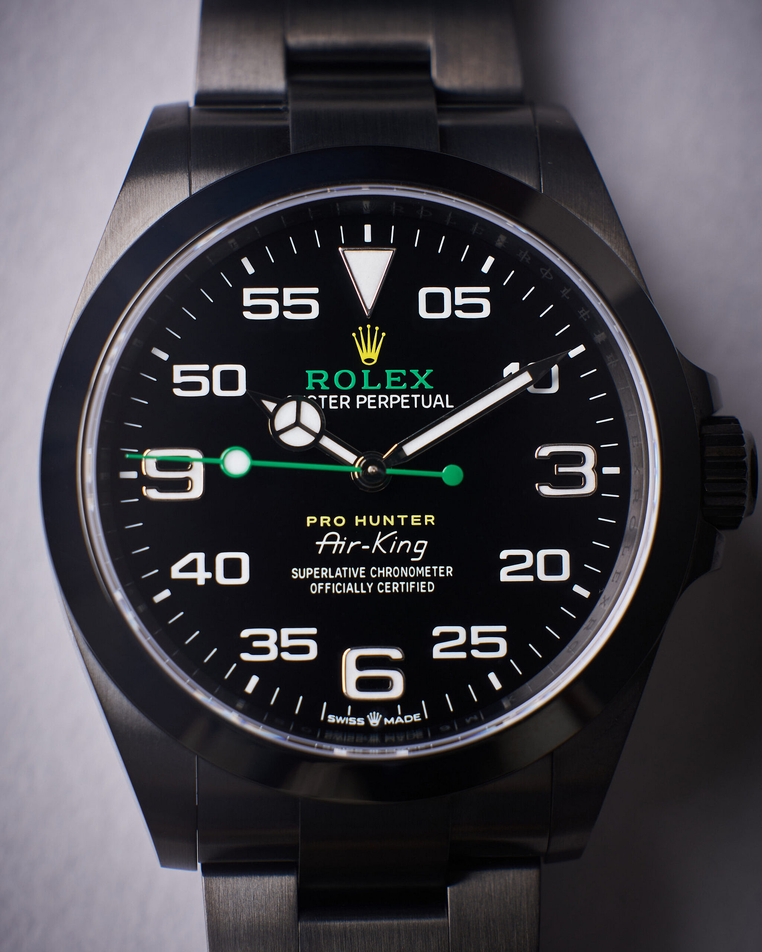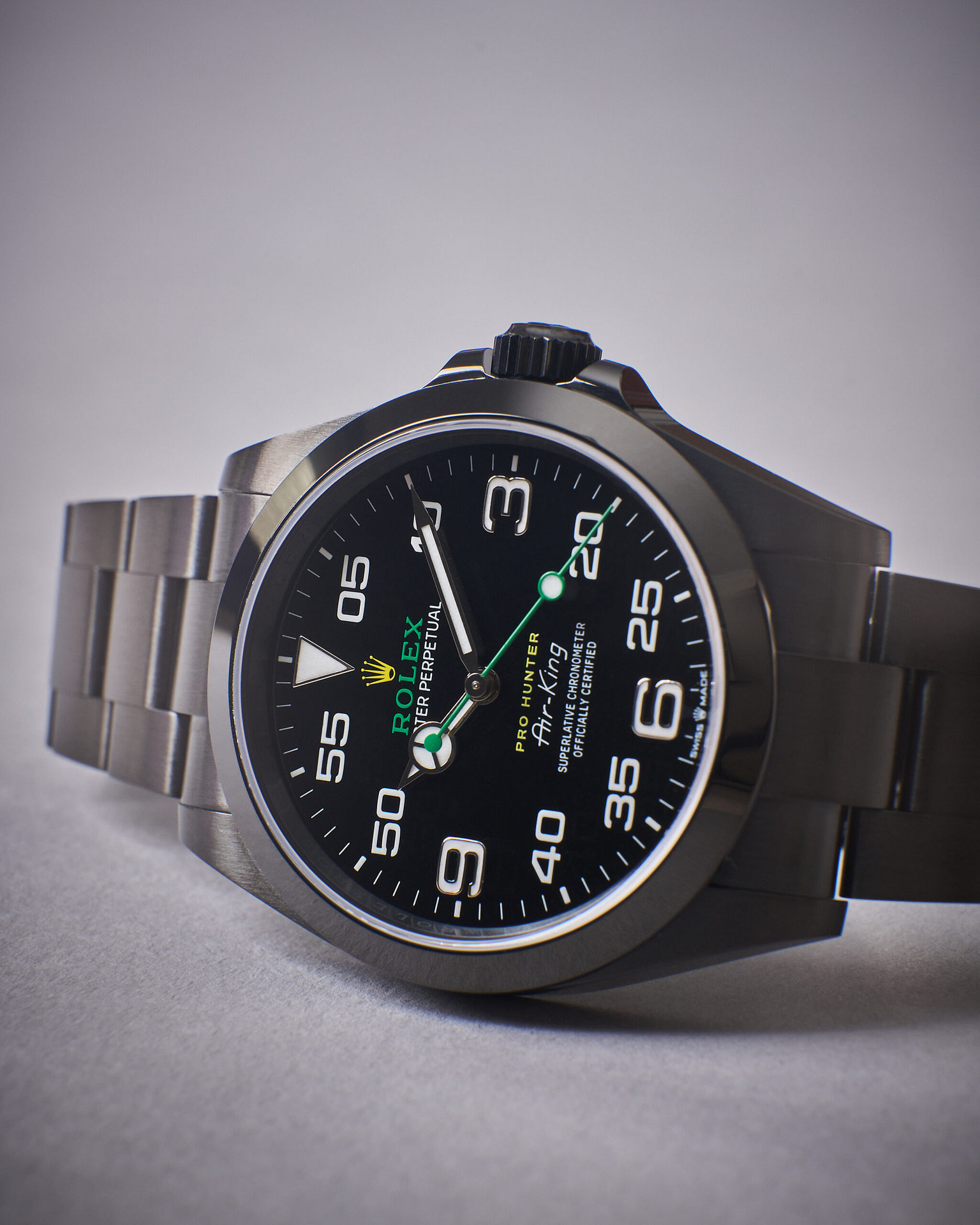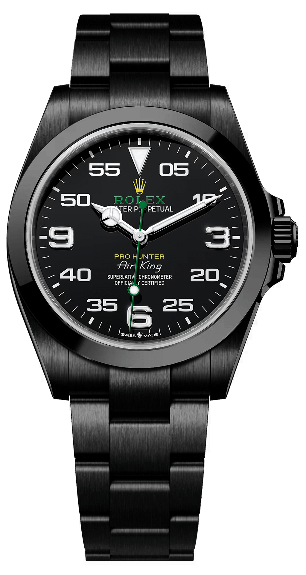 The Pro Hunter Air-King has a diamond-like carbon coating on a 40mm case. The black dial is enhanced with the Pro Hunter logo in yellow with 3, 6 and 9 numerals and a prominent minute scale for navigational time readings. Finished with an anti-reflective coating.