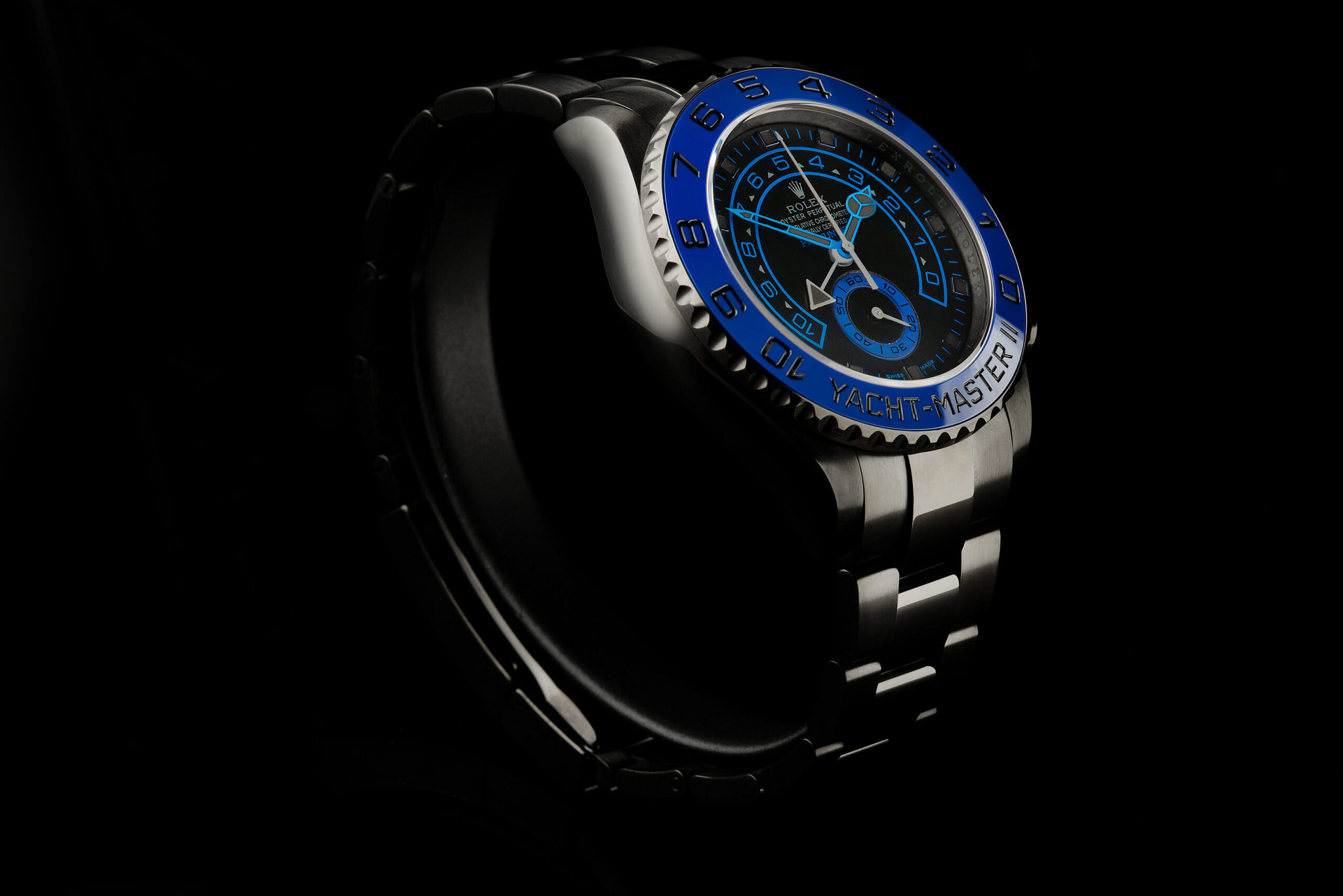 The Pro Hunter Blue Yacht-Master II has a diamond-like carbon coating on a 44mm case. The customised blue and black dial is signed with the Pro Hunter logo in blue and the 5 minute markers and hands have been customised with special black luminous. The blue ceramic insert has been specially enhanced with black numbers.