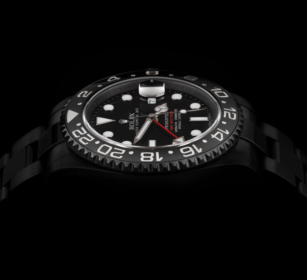 The Pro Hunter Red GMT-Master II Red has a diamond like carbon coating on a 40mm case with a rotatable ceramic bezel. The black dial is enhanced with the Pro Hunter logo in white, ‘GMT-Master II’ in red and a red GMT hand.