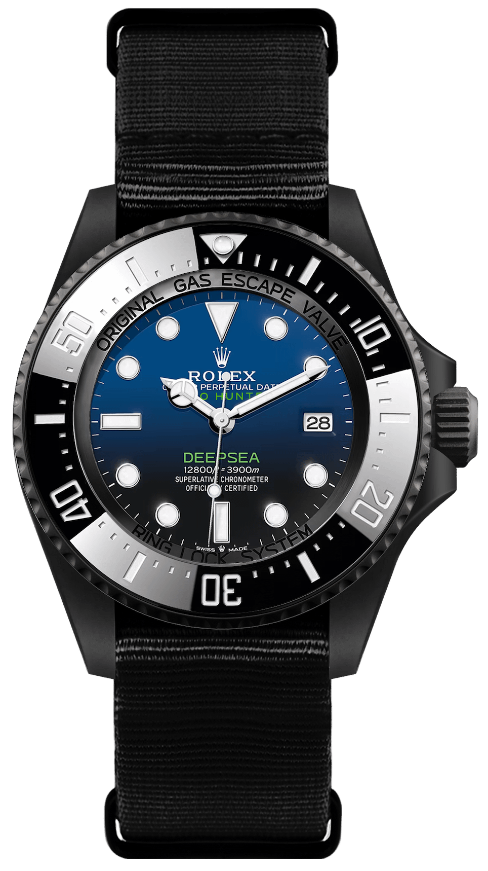 The Pro Hunter Military Stealth Deepsea D-Blue has military fixed bars on a 44mm case and the black dial is enhanced with the Pro Hunter logo and ‘Deepsea’ in green.