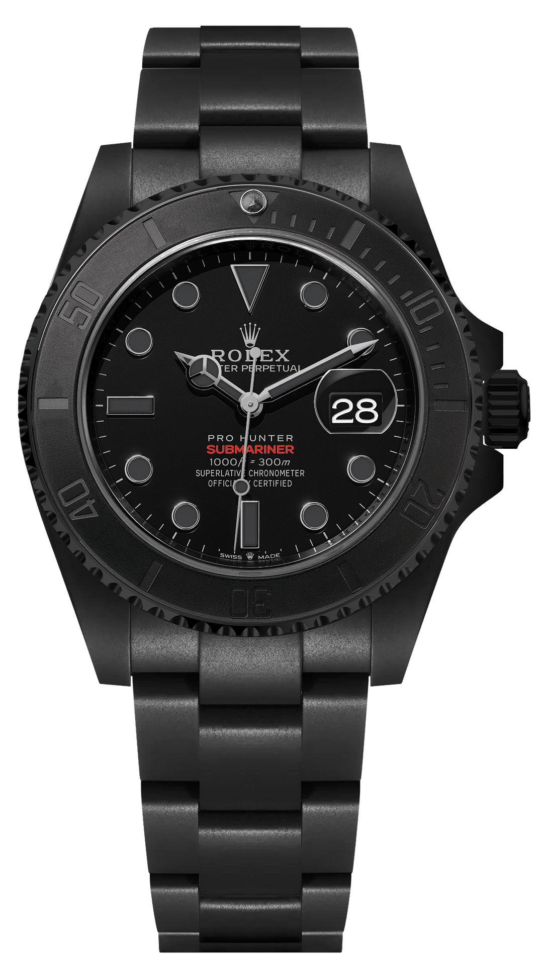 The Pro Hunter Phantom Submariner features include a bead-blasted finish with military-grade diamond-like coating, matt bead-blasted finish bezel insert, a black-lumed pearl, and a special phantom matt dial with inverted-coloured date disc. It has a black lume on the 5 minute markers and hands.