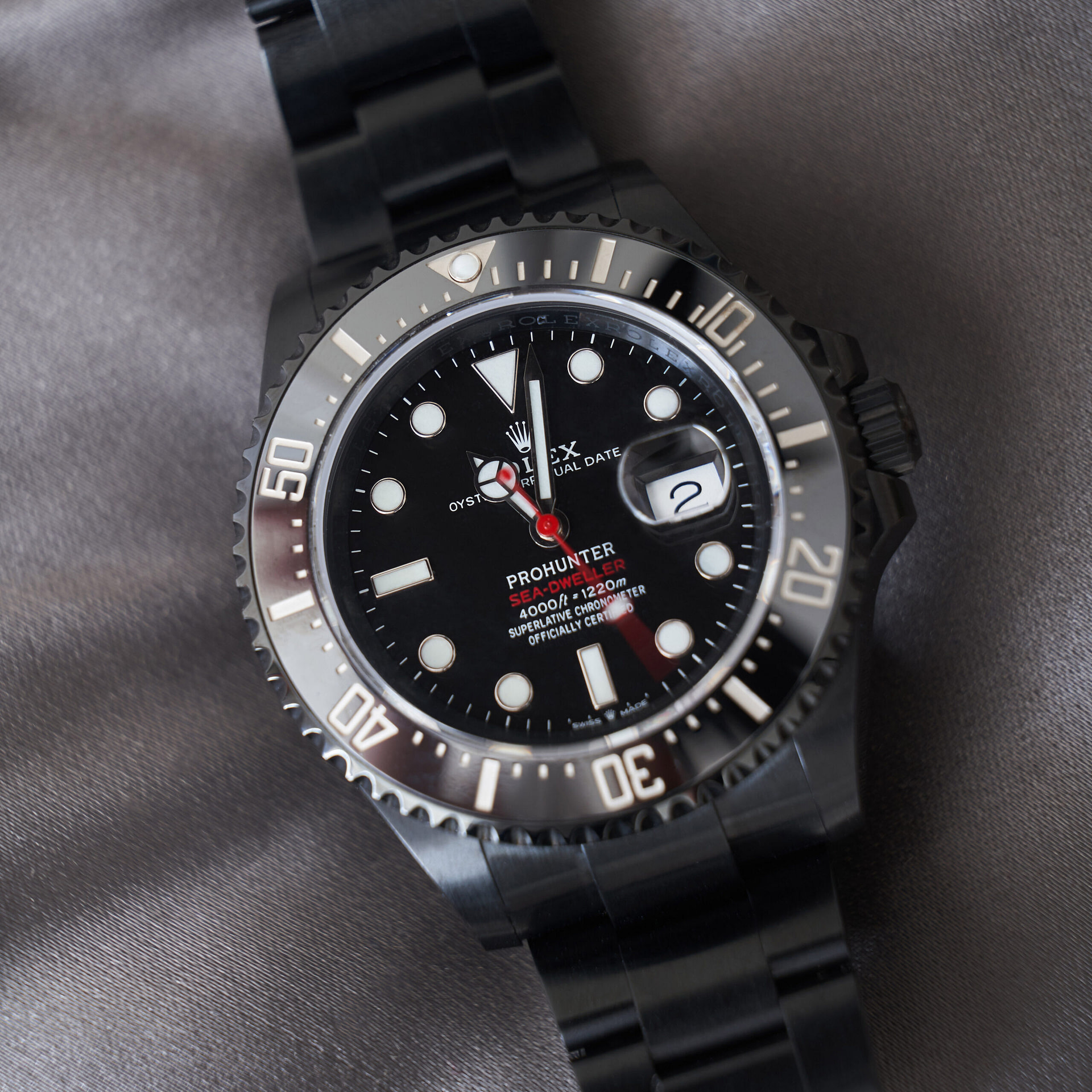 The Pro Hunter Sea-Dweller 43 has a diamond-like carbon coating on a 43mm case, a black dial enhanced with the Pro Hunter logo in white and its sweeping hand in red.