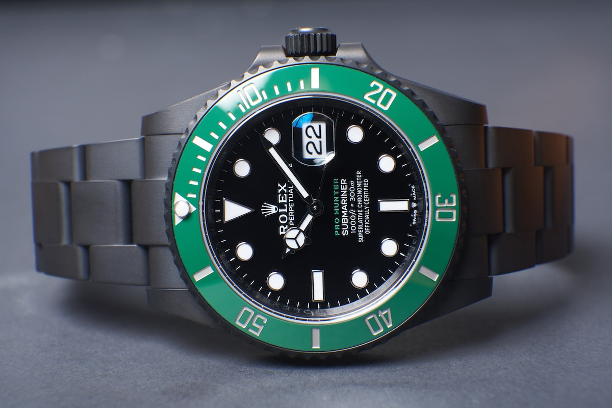 The Pro Hunter Stealth Submariner Date Green has a diamond-like carbon 41mm case with a green rotatable ceramic insert. The black maxi dial is enhanced with the Pro Hunter logo in forest green.